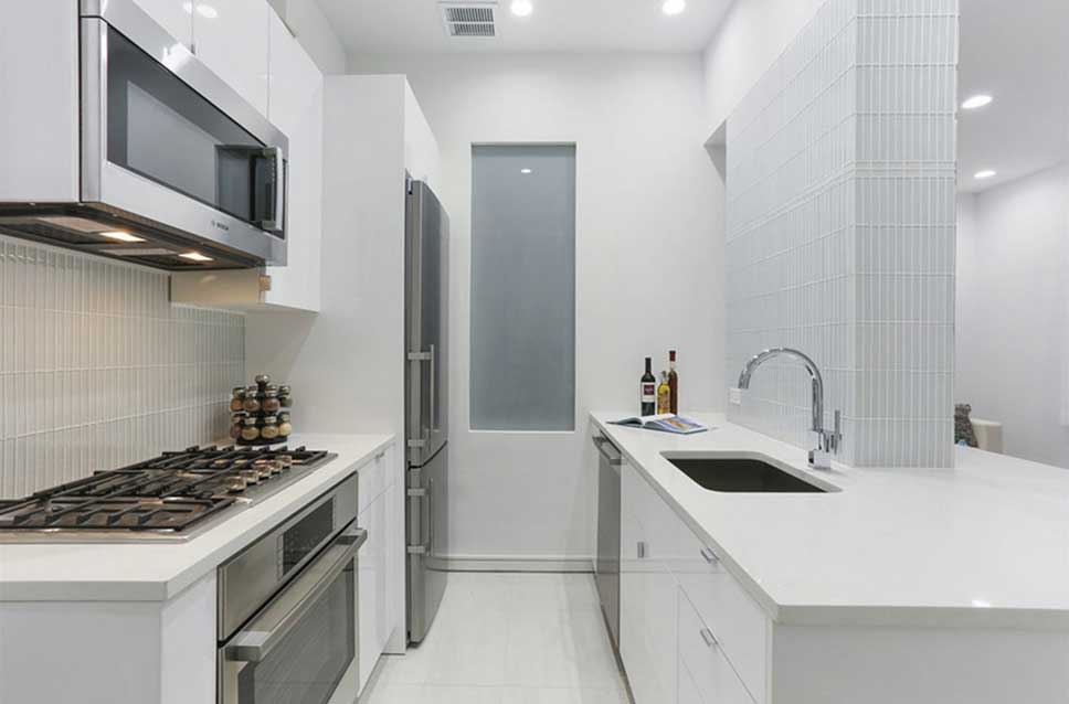 - Двухрядный. Представляет собой два параллельных ряда вдоль стен напротив. Дизайнеры не советуют использовать его в узких помещениях, чтобы не создавать эффект коридора. Но если вам нужно много места для хранения и большая столешница — это отличный вариант. Оптимальные значения: промежуток между рядами — 100-150 см, ширина кухни — 240-250 см. Если кухня уже, сократите глубину шкафов, чтобы между ними остался минимум метр.