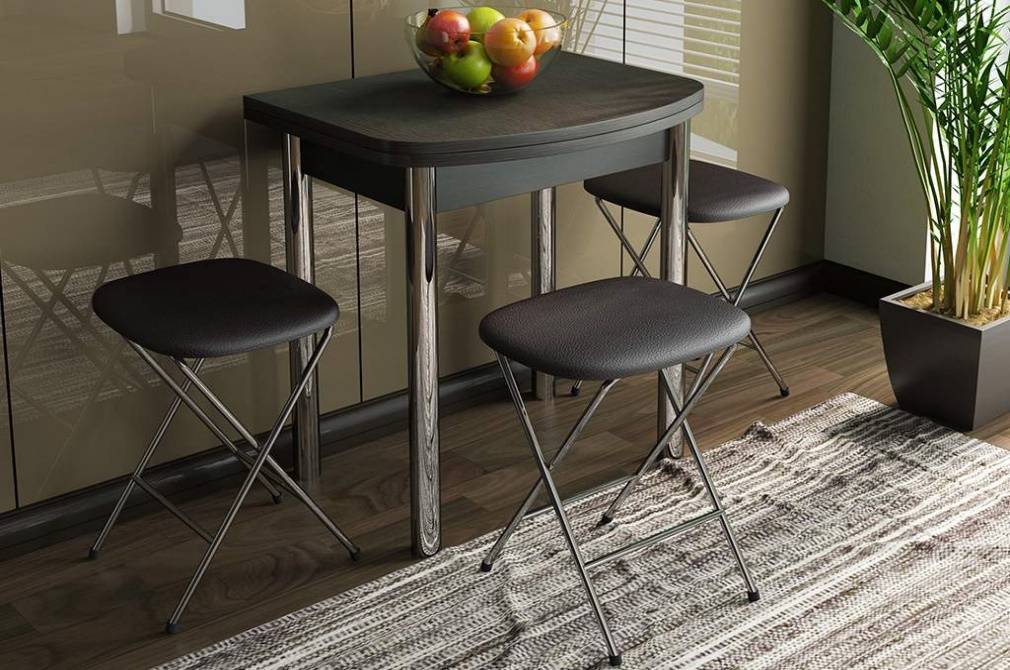 Дизайнеры предлагают множество идей трансформирующегося стола для маленькой кухни. Это многочисленные варианты с откидными, выдвижными, раскладывающимися столешницами. Используют принципы «бабочка», «книжка», модели с подпорками, на колесиках и так далее. Предпочтительно, чтобы в комплекте с таким изделием были стулья или табуретки, которые можно вставить друг в друга в виде компактной «пирамиды». Это позволит хранить их в кладовке или на балконе.