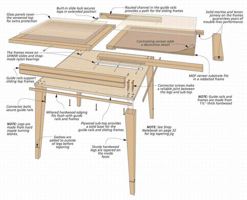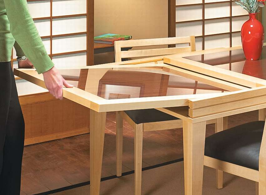 Тем не менее, обычно, чтобы расширить стол, вам придется его раздвинуть и сложить вкладку, а когда возвращаете в первоначальное состояние, нужно найти место для хранения вкладок, где они не будут повреждены, когда вы их не используете. Этот раздвижной обеденный стол решает проблему с помощью двух «вложенных» столешниц. Верхняя часть выдвигается, затем нижняя скользит вверх и фиксируется на уровне позиции с первой. И еще большой плюс – раздвижные столешницы не требуют необычного оборудования или сложных технологий. Они изготовлены из врезных и шиповых столярных изделий и выдвижных направляющих из лиственных пород дерева, которые вы можете сделать на фрезерном столе.