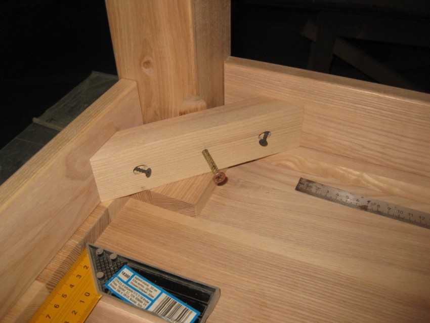 Для этого, как и для крепления ножек к царгам, используют саморезы и просверленные под углом отверстия.
