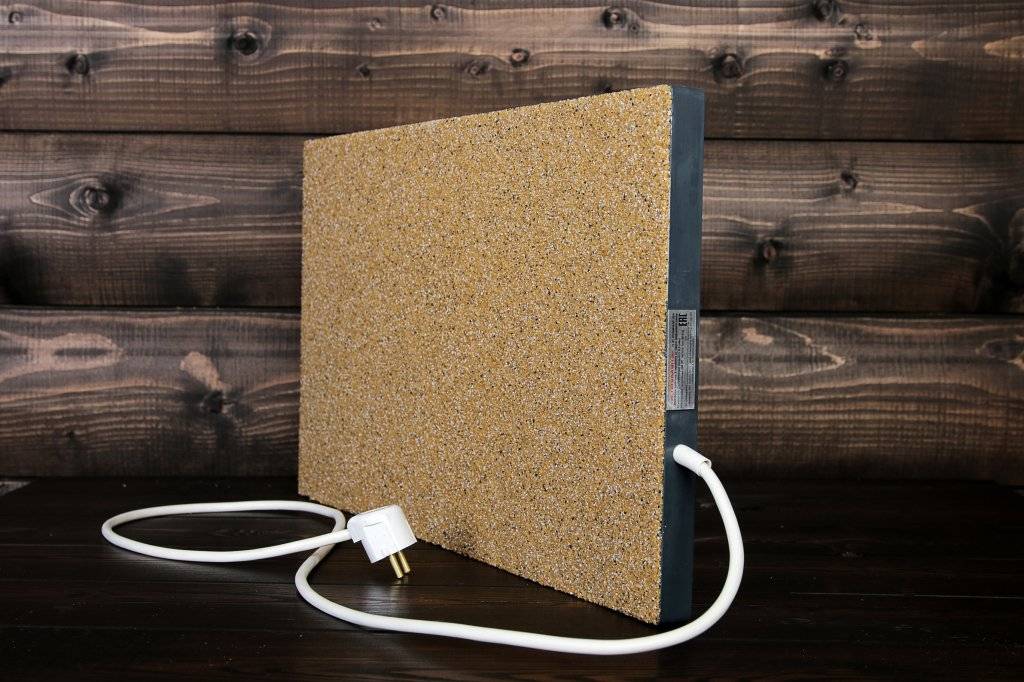 Кварцевый нагреватель (на языке профессионалов – МКТЭН) – это плита монолитного типа, сделанная из специального раствора. Основной составляющей последнего является кварц. Внутри такого устройства размещен хромоникелевый нагревательный элемент в форме спирали. От окружающего воздуха он полностью изолирован. Работает прибор от обычной электросети 220 В. Вы включаете МКТЭН, на спираль подается ток, ждете примерно 20–25 минут. За это время плита разогревается до проектной температуры (она равняется 95 °С) и начинает отдавать благодатное тепло в помещение.