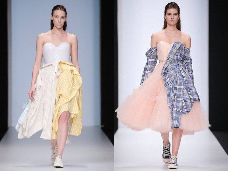 Изюминкой линейки стали мужские рубашки, которые самым невероятным образом сочетались с роскошными женственными образами, гармонично дополненными мягкими спортивными кедами преимущественно белого цвета.