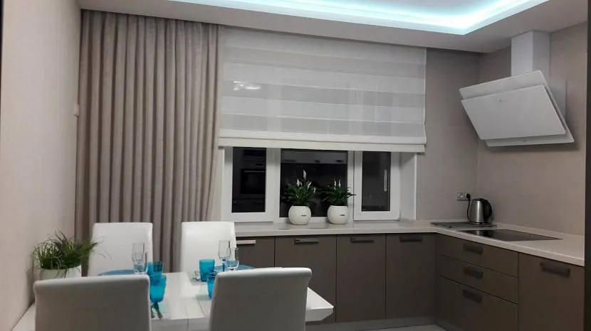 - Комбинированные. Соединяют в себе жёсткое основание и мягкие складки. Предназначены для просторных комнат с большими оконными проёмами и высокими потолками.
