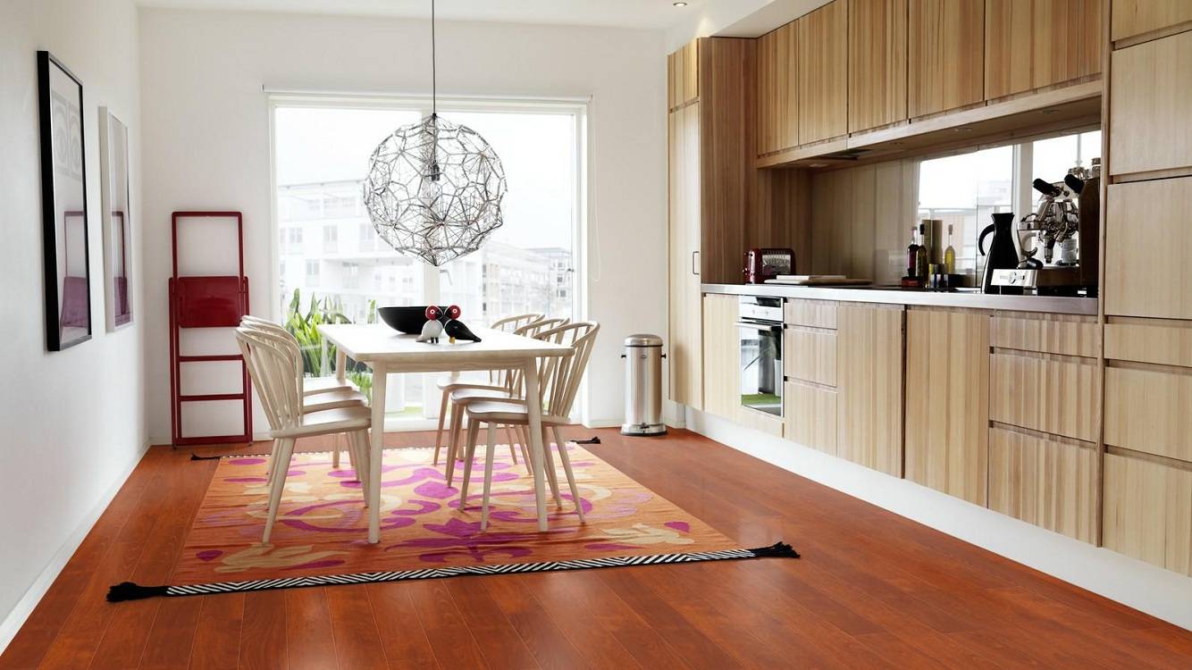 Достоинств у ламината немало. Почитатели эко-дизайна высоко оценивают ламинат за возможность поразительного сходства с натуральным деревом. Хозяева же с нотками экономичности в характере, подобное покрытие для пола привлекает своей невысокой стоимостью, а людей практичных и не любящих трудности — простотой монтажа. Любое из данных качеств может проявиться в разнообразных видах ламината. Но, естественно, чем ламинат дороже, тем он и качественнее, так бывает в большинстве случаев. Хороший ламинат вовсе не боится трещин и царапин, ударов и сколов, то есть, механических воздействий. Также он устойчив к быстрому истиранию, нормально относится к повышенной влажности (в зависимости от вида) и перепадам температуры на кухне, не боится пятен и легко поддается уборке.