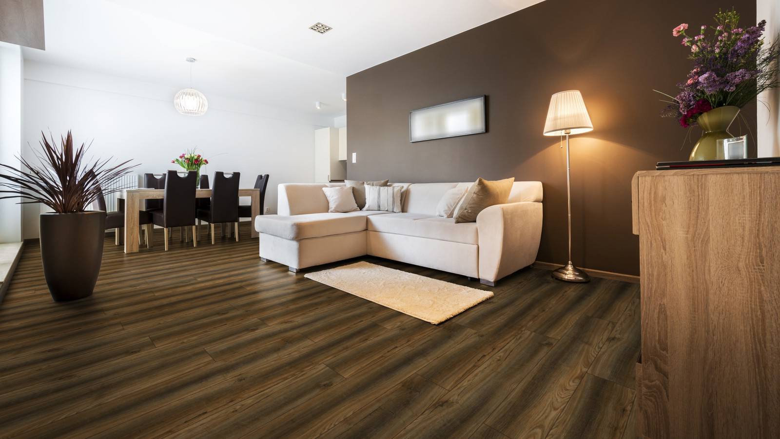 Стену за диваном можно акцентировать ламинатом. Он идеально подходит для акцентирования внимания в помещении и превращения его в главную точку интереса.