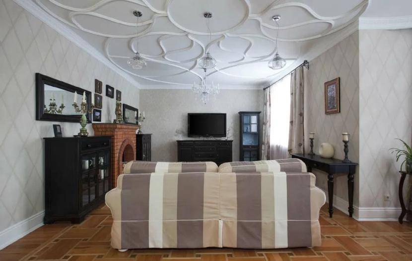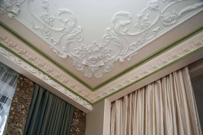 - Отделка потолка лепниной позволяет скрыть некоторые дефекты, а также маскирует коммуникации;