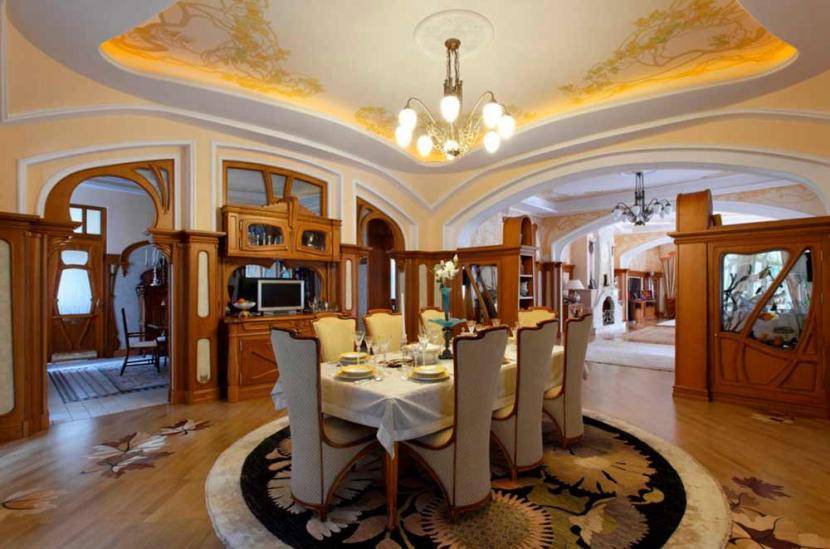 - Потолки с лепниной позволяют зрительно скорректировать геометрию помещения;