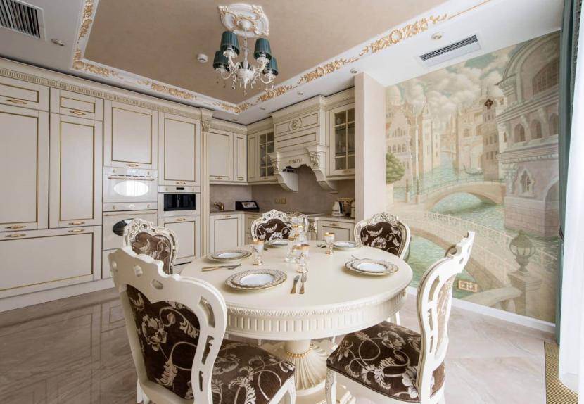 Потолок, выполненный в любом имперском стиле, всегда имеет множество элементов лепнины. Центральная потолочная розетка подчёркивает красоту люстры , несомненно, внесет лепту в общий дизайн комнаты.