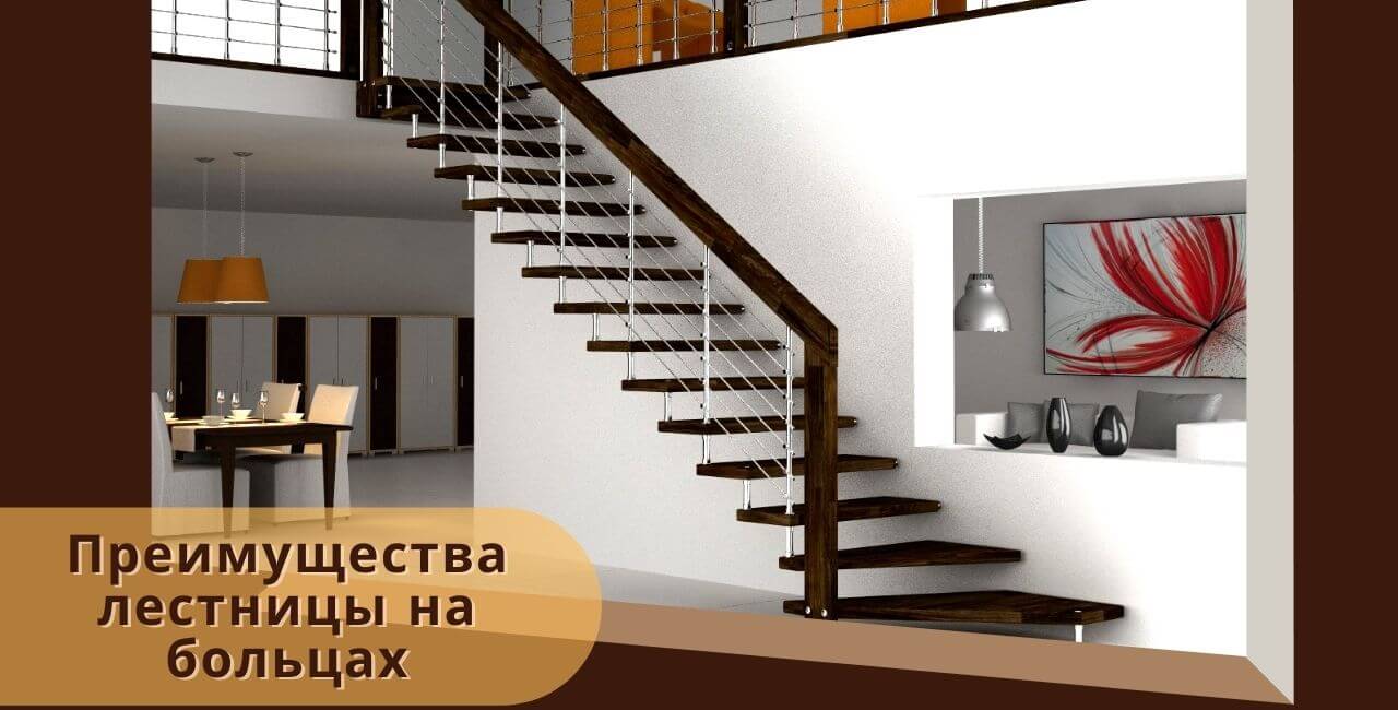 Лестница на больцах обладает рядом достоинств, благодаря которым она высоко ценится и так часто используется в многоэтажных частных домах:
