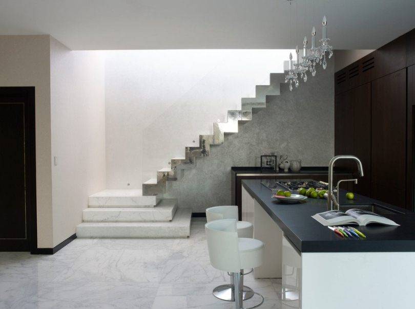 Подобные лестницы, прежде всего, чрезвычайно долговечны: ведь камень и изнашивается медленно и не гниет. Для отделки ступеней чаще всего применяется мрамор (для лестниц внутри дома) и гранит (для наружных).