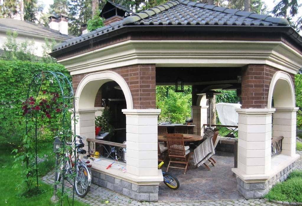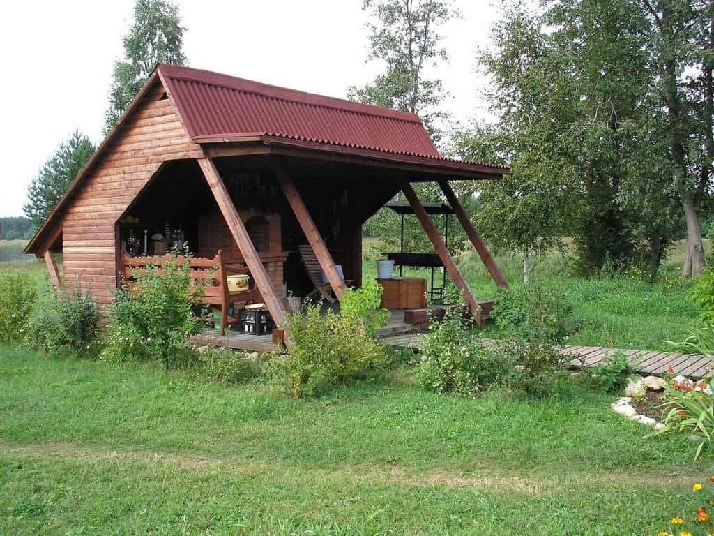 К открытым летним кухням на даче относятся беседки. Они могут иметь бетонное или деревянное основание и навес. Под навесом располагают печь, кухонные шкафы и мебель для рабочей зоны, если прием пищи предусматривается в беседке, то рядом организую обеденный стол и стулья на необходимое количество человек. Летняя кухня типа беседки легко возводится и не требует больших затрат. Проект подобной летней кухни может предполагать наличие барбекю. Недостаток беседки в том, что ее нельзя использовать в холодное время года, в непогоду мебель придется убирать в дом, нет защиты от насекомых или животных, продукты должны всегда быть защищены от ветра и пыли.