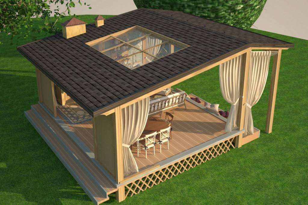 В закрытых постройках край крыши выступает за периметр кухни в среднем на 50 см. Это защитит площадь внутри от косого дождя и иных неприятностей. Строения, выстроенные на открытом солнечном месте, требуют наличия потолка.