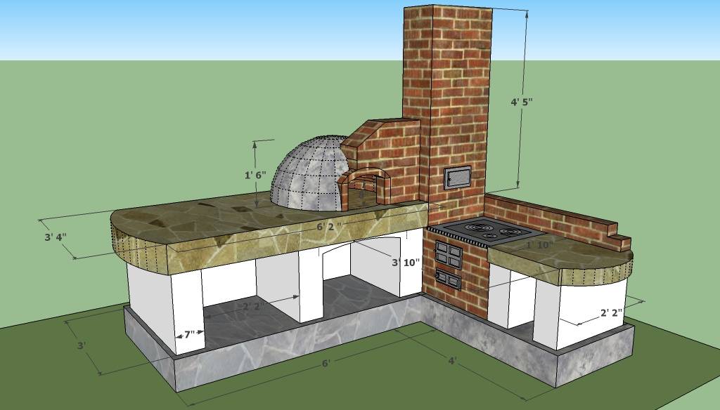 На примере этой кухни можно посмотреть, что летняя кухня своими руками может быть построена в несколько этапов. На первом этапе строится все, кроме печки для пиццы, которая пока есть только в планах, но нет умения ее строить и средств нанимать на ее постройку мастера. Ее отложили на следующий год.