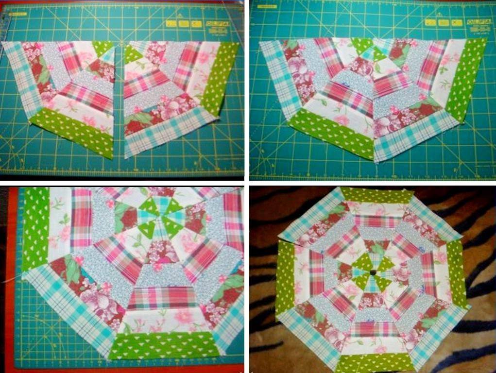 Собираем пэчворк согласно схеме на фото. Собрать большой круг, стежка – мелкая, с припуском 3 мм по краю. Хвосты нити оставлять длинными, чтобы можно было стянуть шаблон.