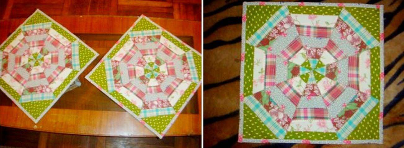 - Противоположный эффект имеют салфетки, выполненные в стиле английского пэчворка из лоскутов правильной формы и сочетающихся размеров. К тому же, картинки, выполненные в этом стиле, несут определенный смысл и содержание.