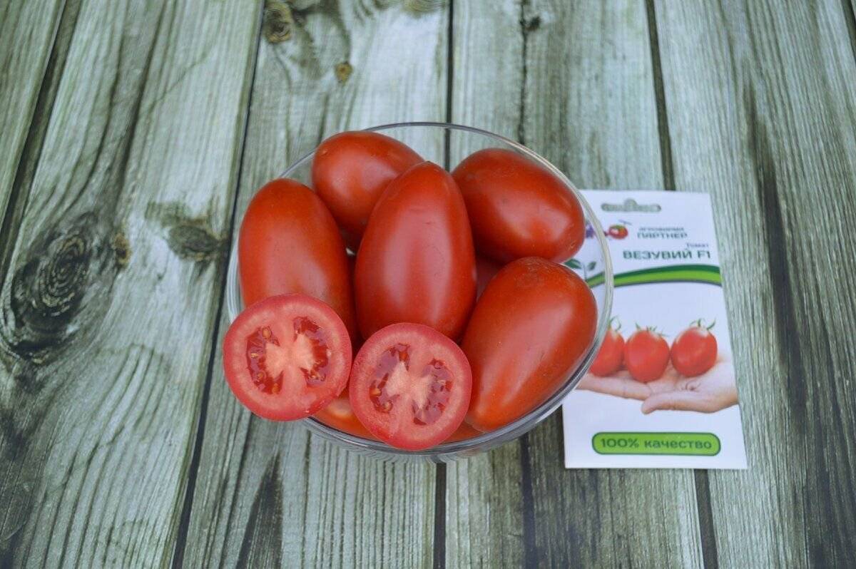 Везувий F Ранний (95 дней), высокоурожайный (до 20 кг с 1 м2). Плод средний (до 100 г), яйцевидный, гладкий, красного цвета. Область применения — универсальная.