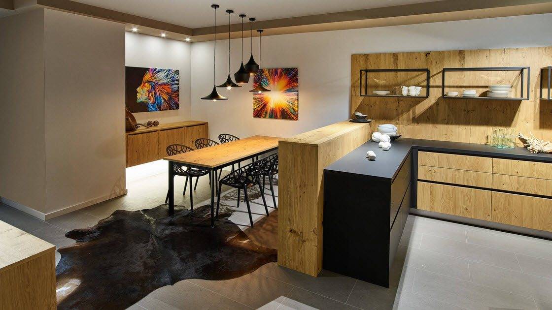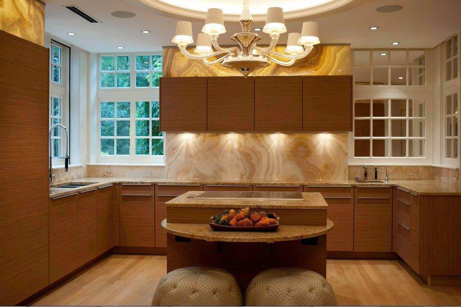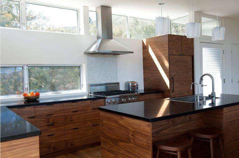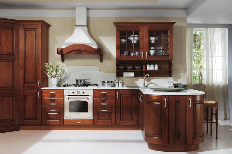- Материал – продукция из натурального дерева, ДСП, МДФ с включением элементов, сделанных из мрамора, металла, стекла, будет стоить дороже, чем строгие классические кухни.