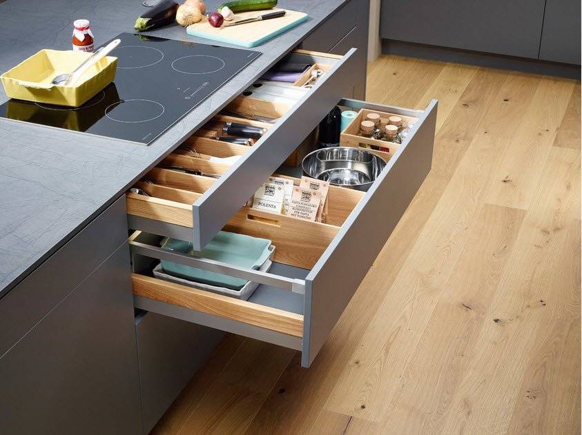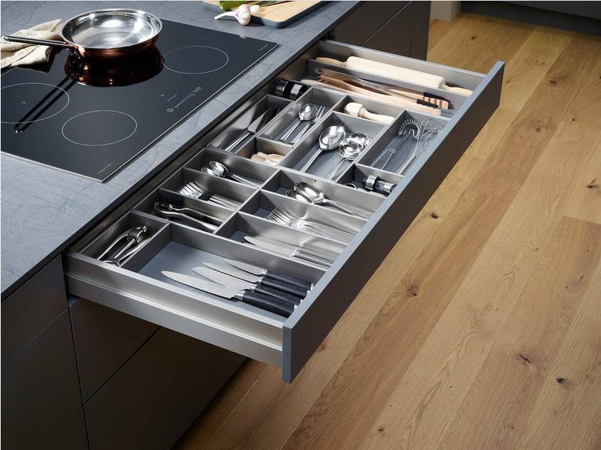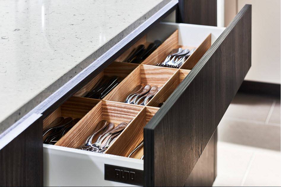 Кроме того, мебель отличается превосходной организацией внутреннего пространства. Ящики подразделяются на отдельные сегменты, контейнеры и другие ёмкости, а также могут выполняться в раздвижном виде – для сочетания дизайна и удобства.