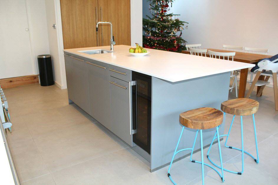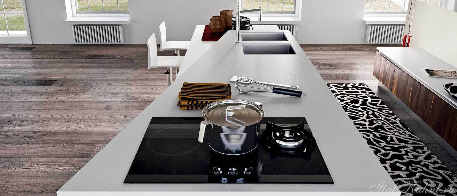 По ширине как навесные, так и напольные шкафчики представлены в трех вариантах — 40, 60 и 80 см. Высота верхних модулей — 68 и 35 см, нижних секций — 85. Глубина нижних модулей меньше стандартной — всего 52 см. Из-за этого возникают нюансы по встройке варочной панели. Примеры решений — смотрите на фото.