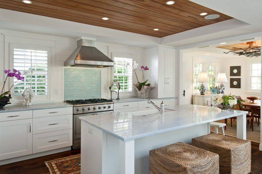 Один из самых необычных и редких решений для интерьера потолка на кухне – деревянная вагонка. Он здорово смотрится в стиле Прованс, особенно если окрасить в белый. Как только поверхность закоптится, его можно будет покрасить вновь – практично!