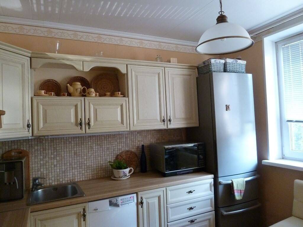 Довольно практичным на кухне оказался потолок из пластиковых панелей. Легкий, недорогой, спокойно переносящий мытье. И простой в установке.