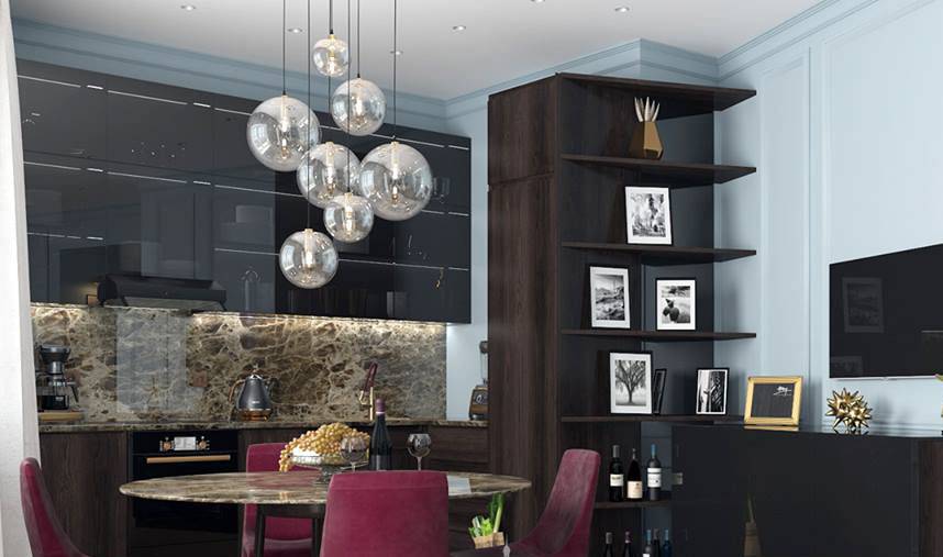 Темная люстра для кухонь может быть из стекла или пластика. Такой аксессуар добавит контраста в светлое помещение. Стильно будет совместить темные плафоны с глянцевым кухонным гарнитуром, добавив в помещение торжественности и роскоши.