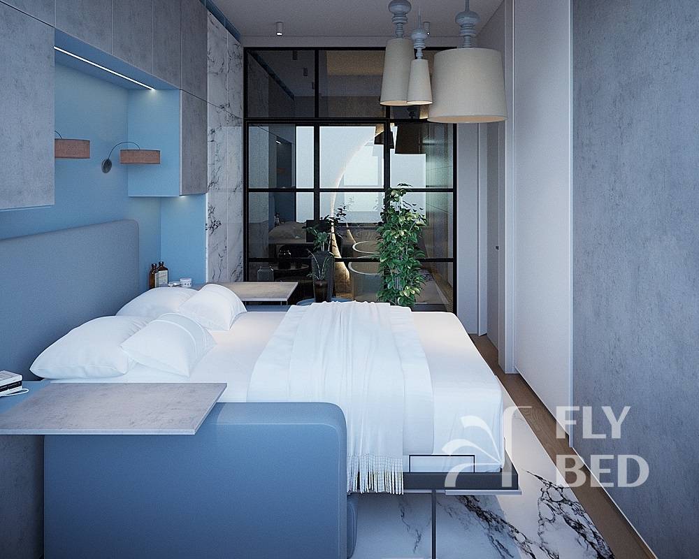 - Диван-трансформер. Состоит из шкафа с полкой, раскладной кровати и дивана. В дневное время суток кровать скрыта в шкафу.