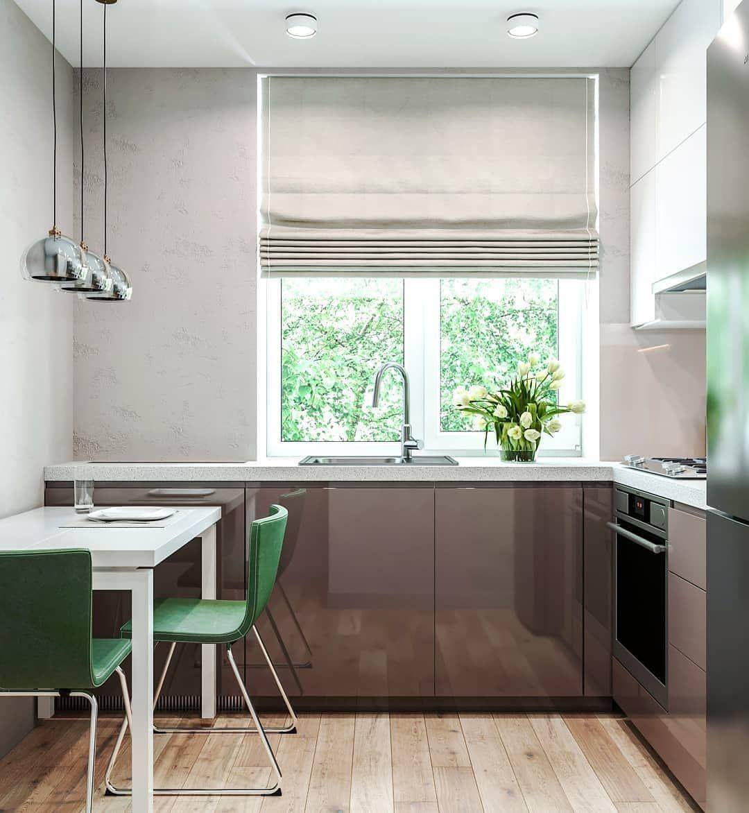 Цветовое оформление – обязательно светлое, с обилием белого и применением глянцевых поверхностей. Так ты деликатно скроешь шероховатости планировки и ограниченный метраж кухни.