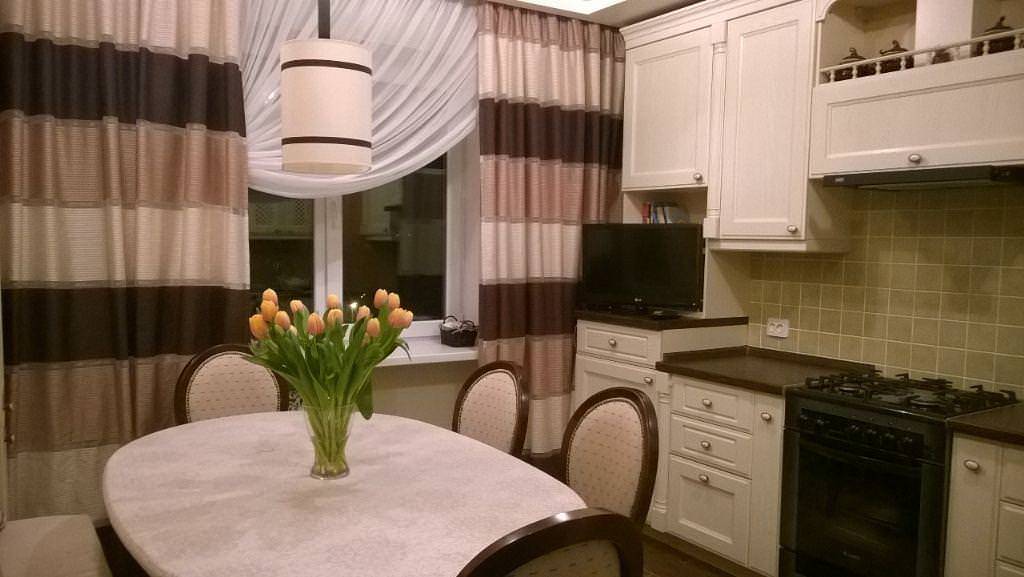 Крепят занавески на карнизе, который монтируют непосредственно под потолком. Такой приём позволяет визуально сделать кухню выше. Для их изготовления используют тюль, вуаль, ситец, лён.