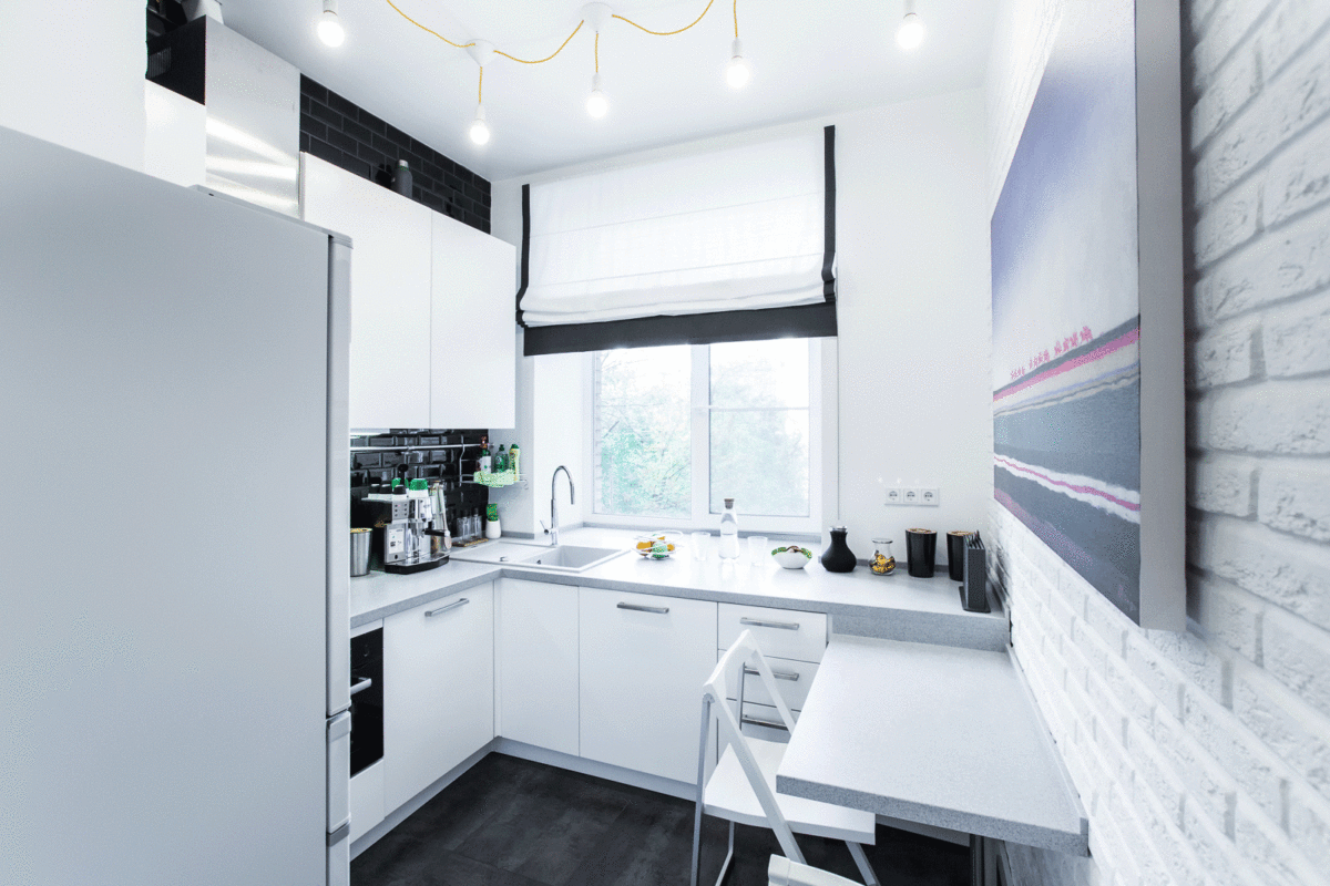 Для обеденной зоны стоит выбрать стол-книжку или откидную конструкцию. Сейчас в продаже имеется много трансформирующихся моделей, так что подобрать подходящую не составит труда. Кстати, для обустройства обеденной зоны часто используется переоборудованный подоконник или барная стойка. Можно установить и кухонный уголок, но в таком случае придётся вынести холодильник за пределы кухни, например, в коридор.