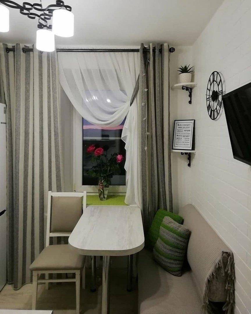 - При недостатке места можно организовать столовую зону рядом с оконным проёмом. В этом случае столешницей служит подоконник.