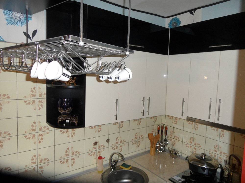 Зачастую в небольших шкафах очень трудно разместить крупногабаритную кухонную утварь (например, большие кастрюли или блюда). На помощь придет пространство в угловом шкафу. Чтобы удобно было в него класть предметы и доставать их, рекомендуем использовать вращающуюся конструкцию — карусель. Однако у такого решения есть один недостаток — углы останутся незадействованными.