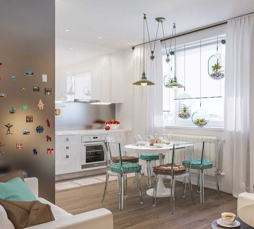Для обустройства обеденной зоны необходимо выбрать функциональную мебель — рекомендуется отдавать предпочтение раскладным конструкциям, которые можно в любой момент сложить и задвинуть в угол.