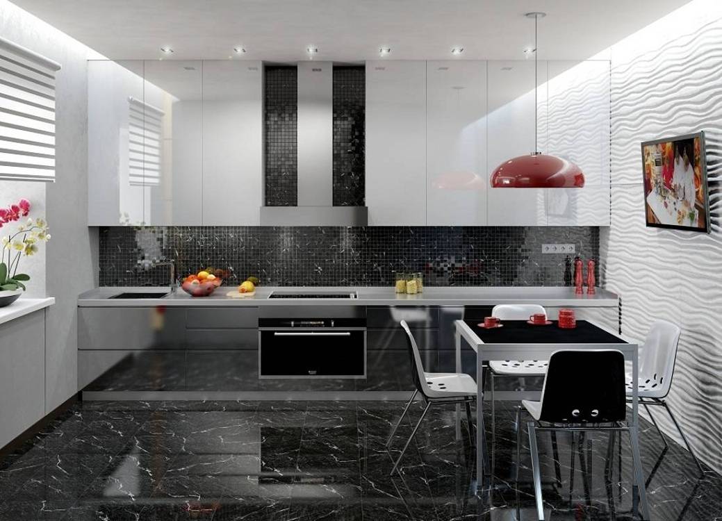 Любая деталь красного цвета в черно-белом интерьере придаст кухне динамичности и легкой агрессии.