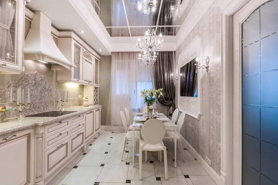 При такой планировке остается место для обеденной группы. Для узкой комнаты подбирают комплект, который легко помещается вдоль одной стены. Стол можно поставить около окна. Квадратное пространство позволяет для мебели подобрать параллельную или П-образную расстановку