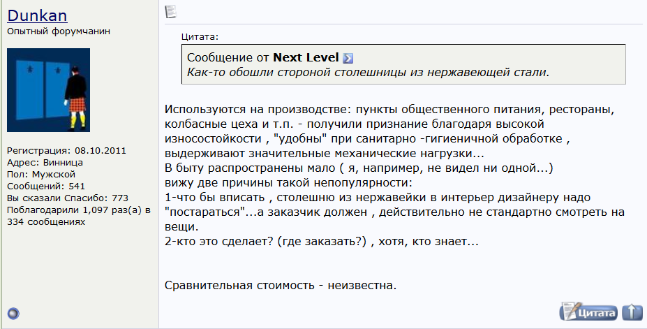 Далее приводим один из отзывов, относящийся к рабочим поверхностям из “нержавейки”.