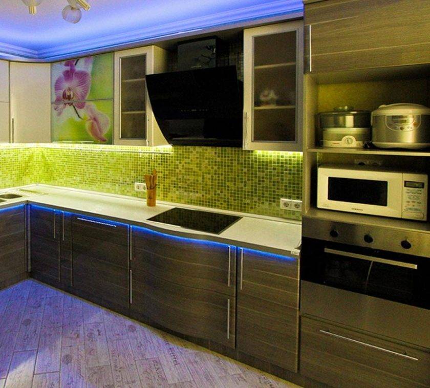 Встроенные источники освещения делают помещение просторнее, выделяют отдельные зоны. С помощью LED-светильников можно подсветить потолок, полки кухонных шкафов, создать иллюзию парения мебели (при монтаже источников света в пол), подчеркнуть необычный декор или форму гарнитура.