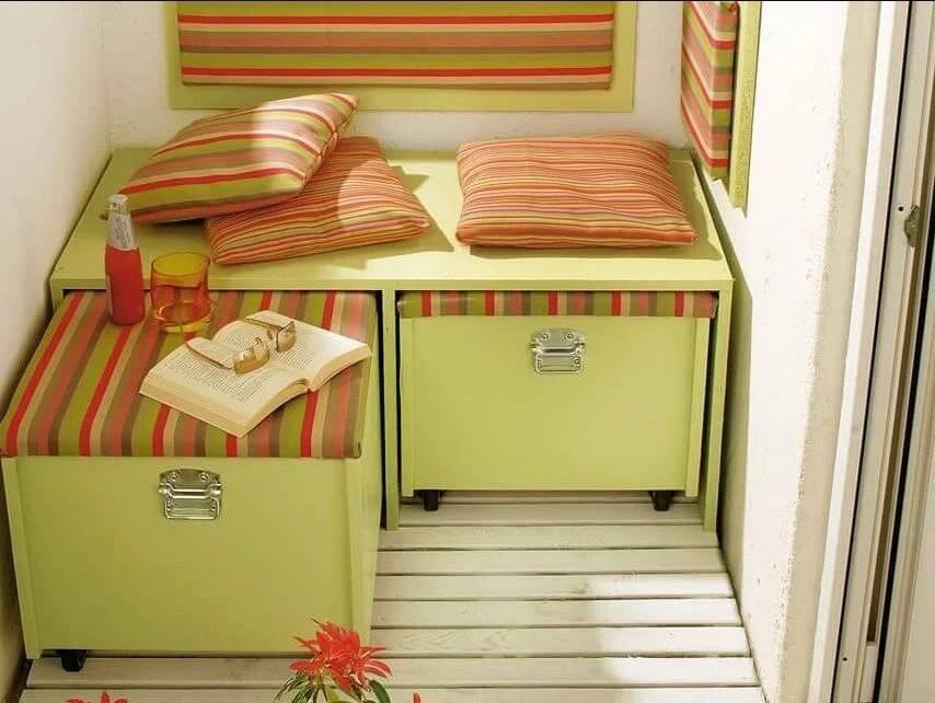 Диван на балконе предназначен не только для отдыха. Он должен быть оснащен вместительным пространством для хранения вещей. Наиболее эргономичными являются шкафы-диваны на балкон