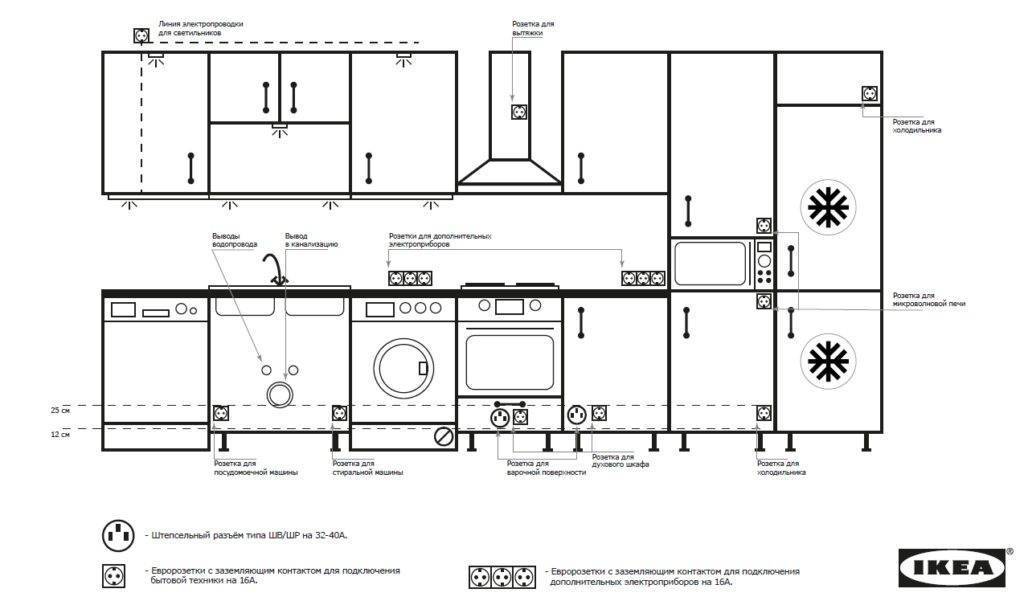 Перед тем как отправляться в магазин за кухней Икеа, нужно самостоятельно или с помощью специалиста сделать замеры и выбрать планировку. Например, расстановка плиты с вытяжкой и мойки определяется коммуникациями. Холодильник, другую технику и функциональные зоны желательно располагать по правилу рабочего треугольника.