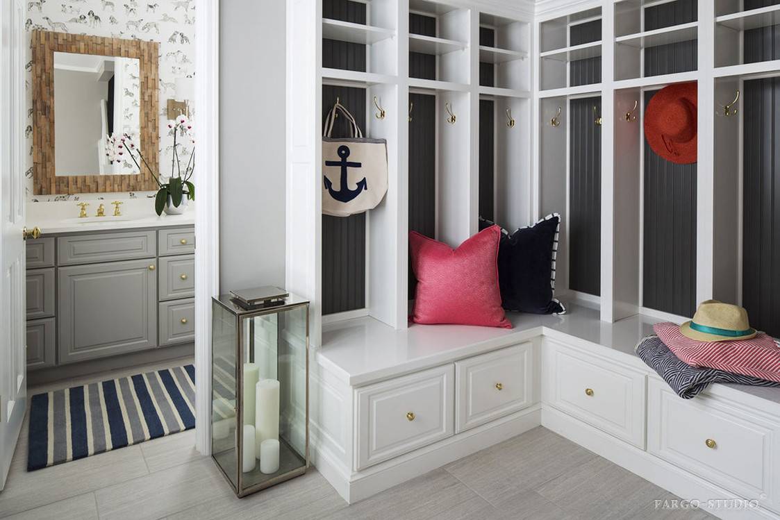 На фото коридор в морском стиле со шкафом в виде трапеции и мягкими сидушками.