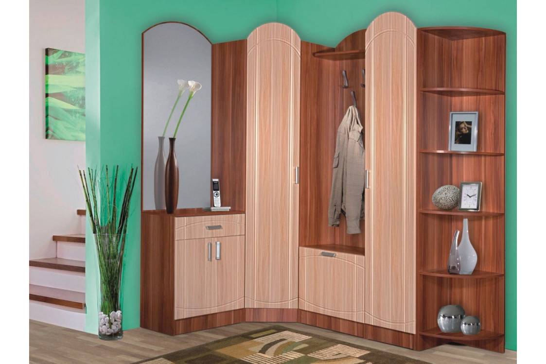 Прихожая, занимающая один из углов – распространенный вариант меблировки. Благодаря такой мебели помещение становится уютным. Оптимальный вариант для малогабаритной квартиры мебель симметричной формы, шкафы и закругленными краями. Практичные открытые конструкции смотрятся современно.