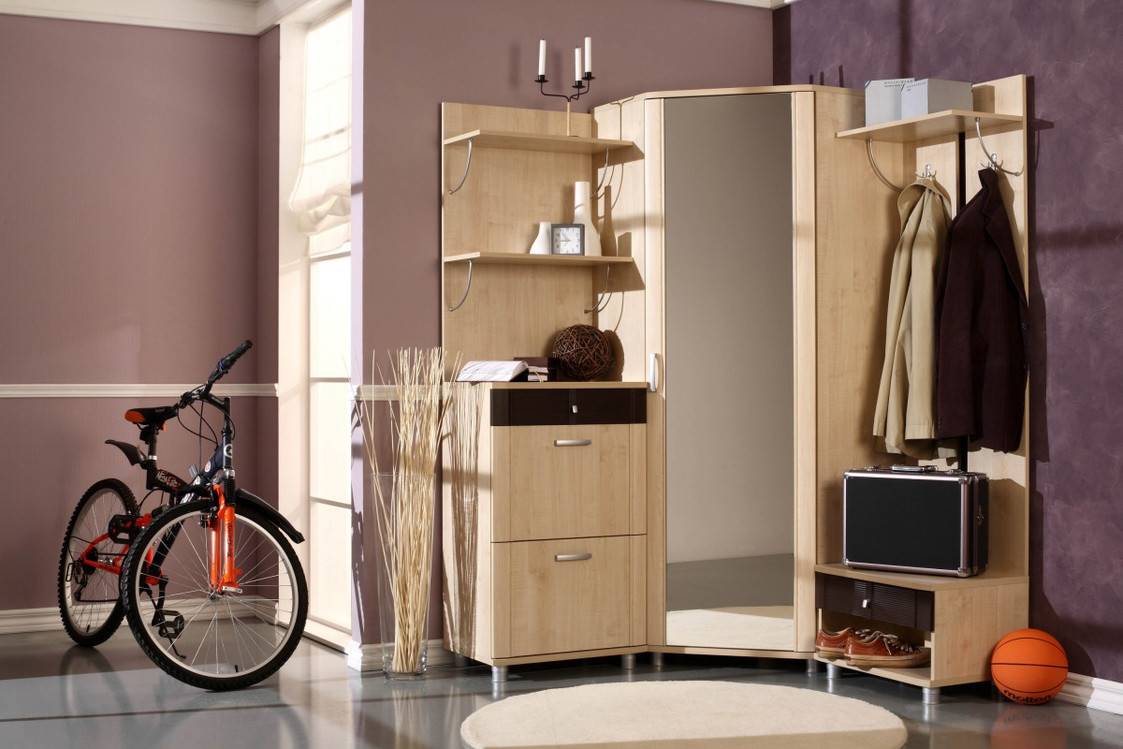 Если вместительность конструкции не стоит на первом месте, то небольшая треугольная или трапециевидная модель замечательно впишется в любую прихожую.