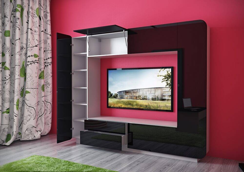 Все большую популярность набирают стенки с телевизором на фасаде шкафа. Это красиво, удобно, практично. Но, чаще всего это очень габаритные модели, занимающие много места. Для решения этой проблемы разработана мини версия – горка. Она представляет собой несколько функциональных секций с различным назначением.