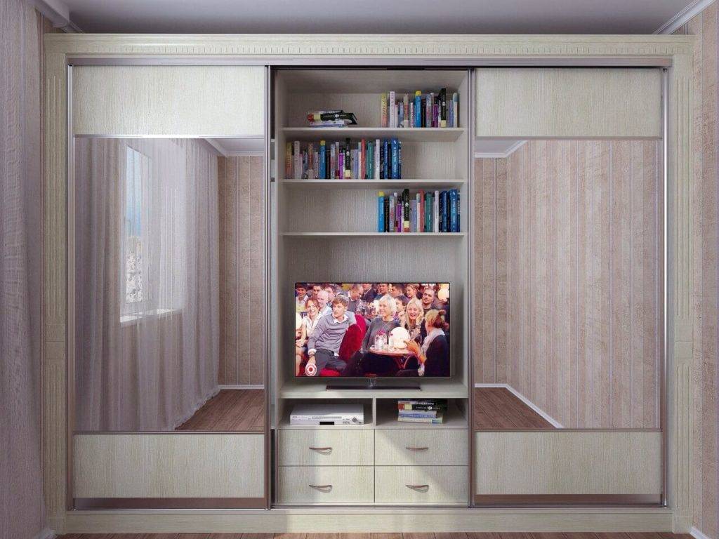 Ниша может располагаться в любом месте, но в первую очередь она должна обеспечивать достаточный обзор экрана. С этой целью она делается менее заглубленной, чем остальные секции. Чаще всего нишу оставляют открытой, но есть варианты и со створками. Хотя, самые оригинальные купе предусматривают прорезь в дверцах в районе расположения телевизора или монтаж экрана прямо на фасад. Хлопотный вариант, создающий проблемы с протяжкой проводов (их сложнее скрыть).