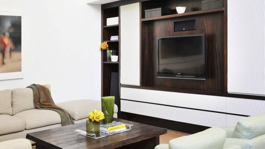 - Можно встроить телевизор в модульную мебель. Обычно производители сразу предусматривают для него свободное место. Крепиться телевизор может либо на стене, либо в задней части мебели.