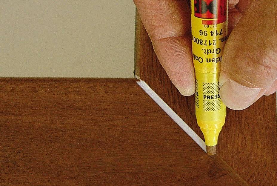 Её необходимо увлажнить фломастером, подобранным под цвет мебели, и лёгкими вертикальными движениями растереть на месте потёртости. По достижению необходимого красящего эффекта наносится лак для фиксации результата.