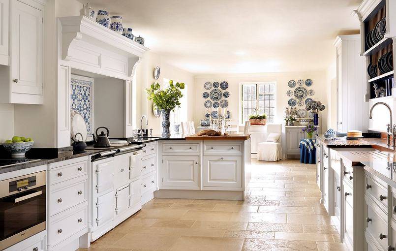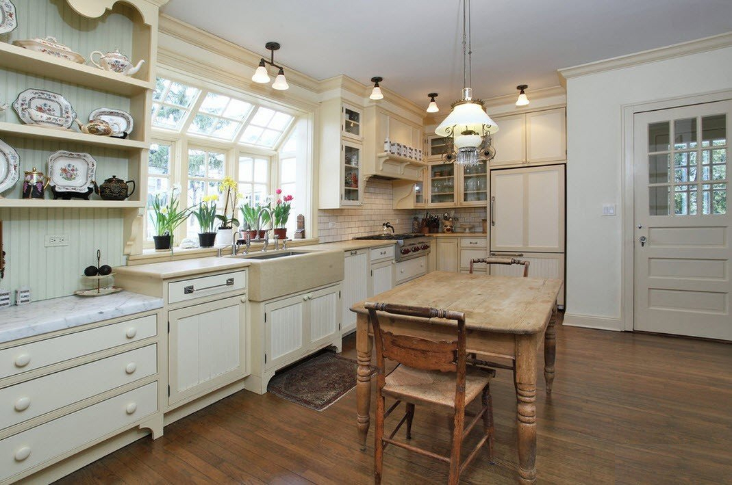 В идеале кухня в кантри стиле предполагает использование деревянных или каменных полов. С этим не возникнет проблем в загородном доме, но для оформления квартиры такой вариант сложно назвать оптимальным.
