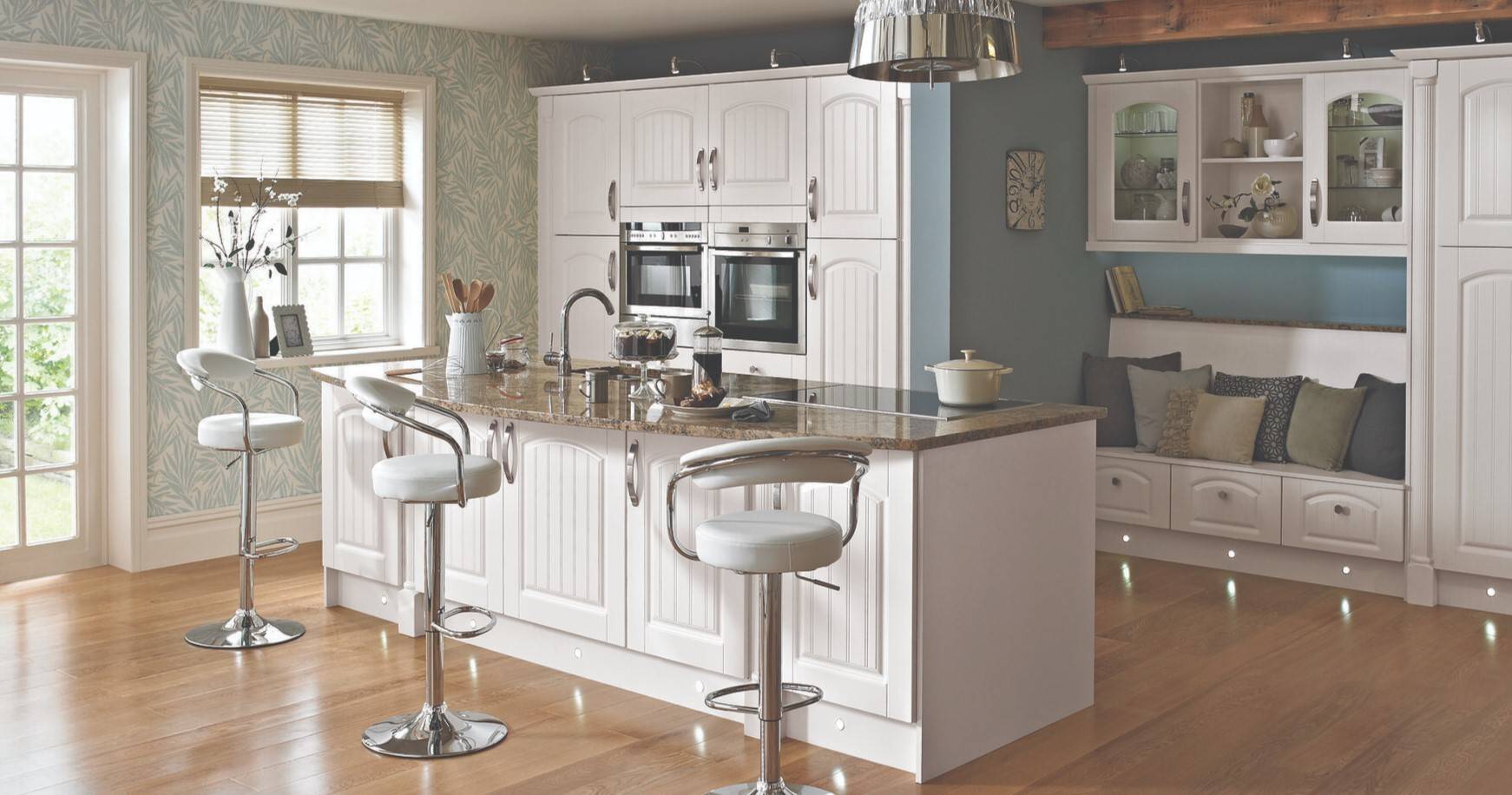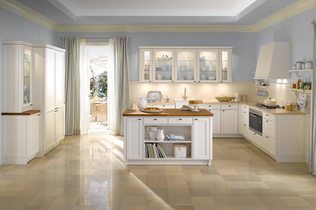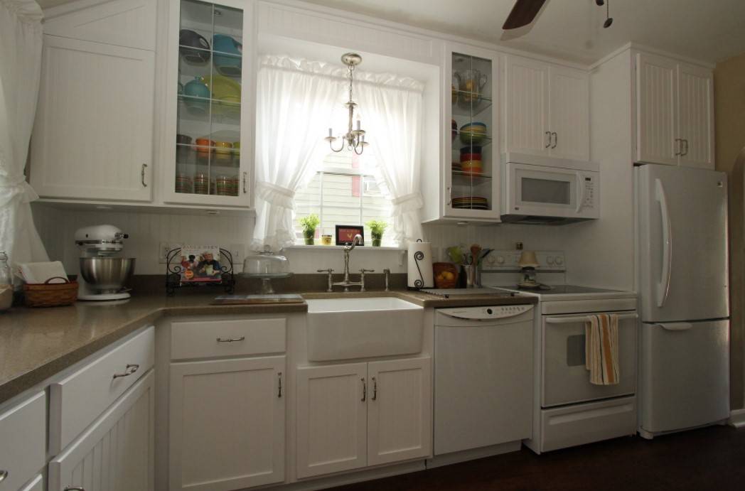 Применение белого цвета, обеспечивающего стильную отделку кантри-кухни, уместно в малогабаритных квартирах, где есть потребность в визуальном увеличении пространства.
