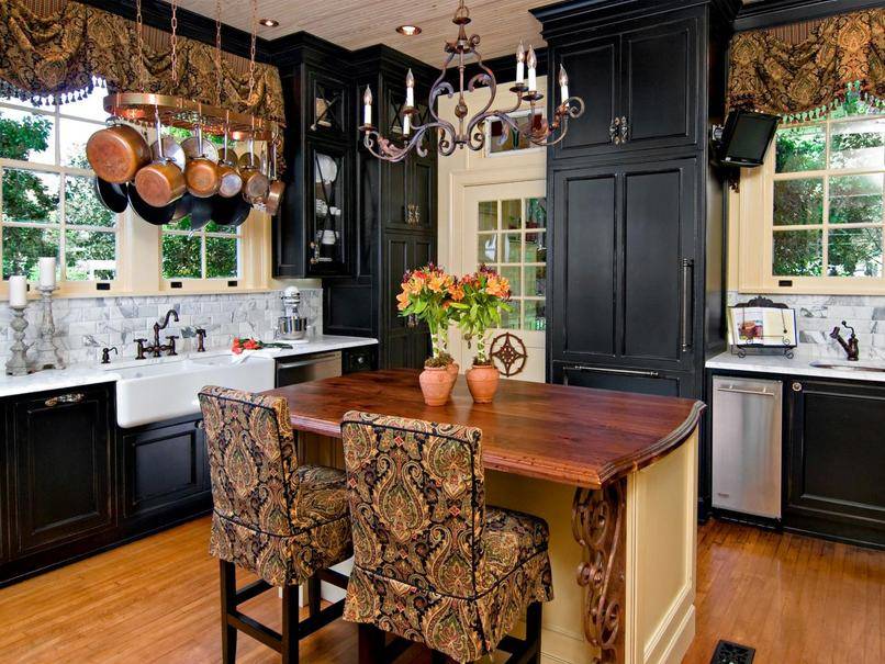 Кантри-кухня, выдержанная в черном цвете, редкое явление. Но с учетом моды на темные гарнитуры, такой вариант допустим. Черная мебель органично впишется в кантри-лофт или эклектичное направление, содержащее элементы сельского стиля.