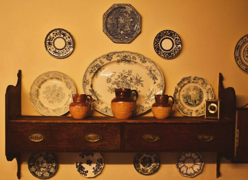 Стилистика кантри предполагает декорирование стен с помощью классических предметов интерьера. К ним относятся картины, специальные тарелочки и постеры, соответствующие общей атмосфере.